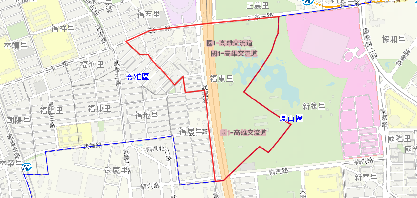 行政區域範圍: 北至‥三多一路與福西、正義里為界 南至‥武營路571巷與鳳山市為界 東至‥武營路與鳳山市為界 西至‥武嶺街與福人里為界 學區:國小‥福康國小 國中‥中正國中 |
